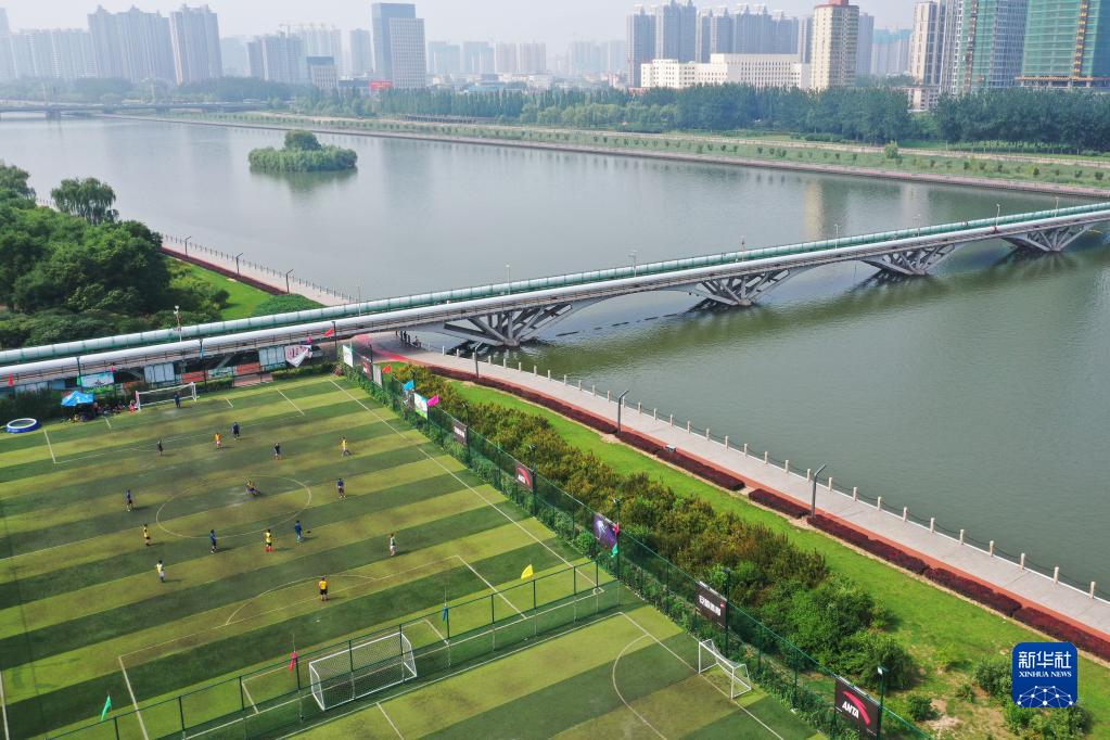市民在太原市汾河畔的公園內踢足球(無(wú)人機照片,2019年7月28日攝)。新華社記者 楊晨光 攝