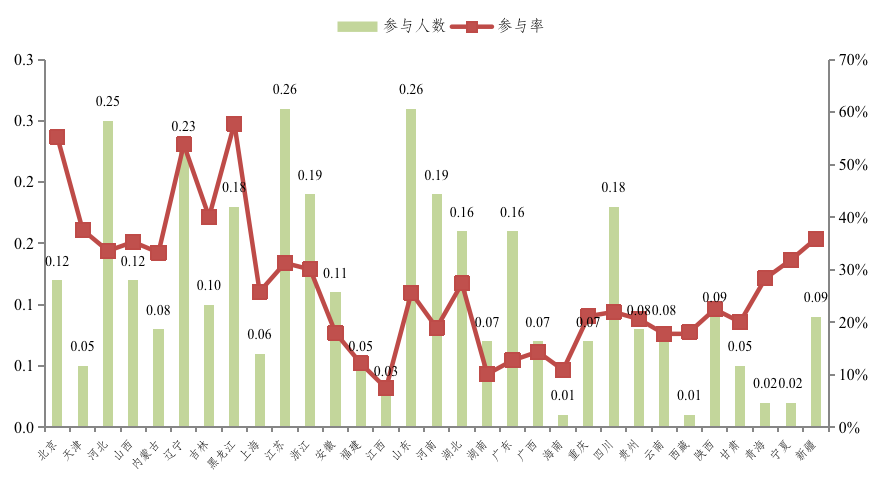↑31個(gè)?。▍^、市)居民冰雪運動(dòng)參與人數及參與率