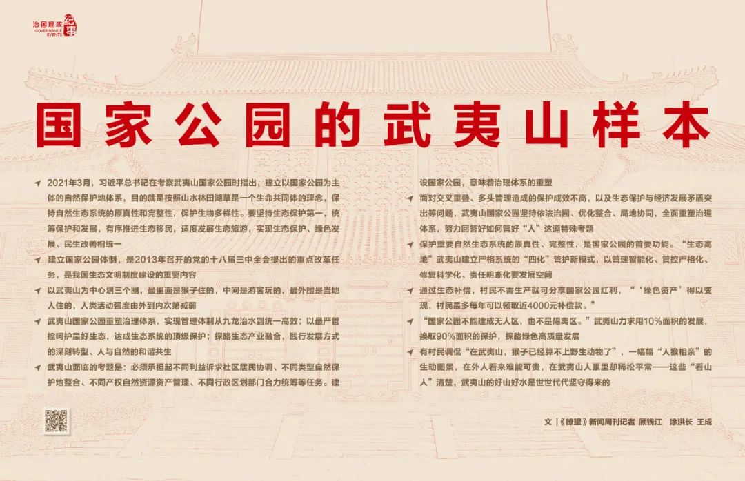 南平市有關(guān)負責人表示,南平市提出打造“環(huán)武夷山國家公園保護發(fā)展帶”的設想,力圖把武夷山國家公園打造成為統籌保護與發(fā)展的樣本,人與自然和諧共生的現代化先行示范區,為我國生態(tài)文明建設提供參考模式和范本,也為世界生態(tài)建設和環(huán)境保護貢獻中國智慧和中國方案。(記者 顧錢(qián)江 涂洪長(cháng) 王成 刊于《瞭望》2022年第3期)