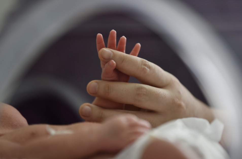 在江蘇南京市江寧醫院,醫護人員跟一個(gè)新生兒握手。新華社發(fā)(方東旭 攝)