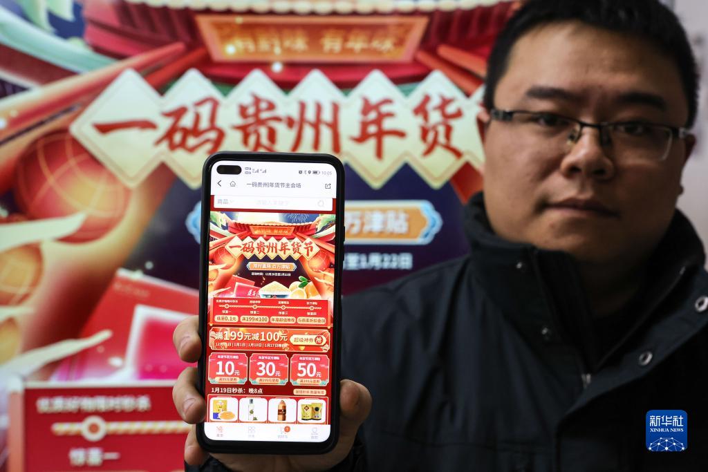 1月18日,工作人員通過(guò)手機展示“一碼貴州”年貨節線(xiàn)上下單頁(yè)面。新華社記者 歐東衢 攝