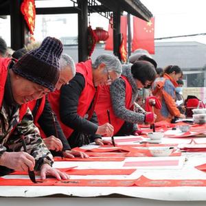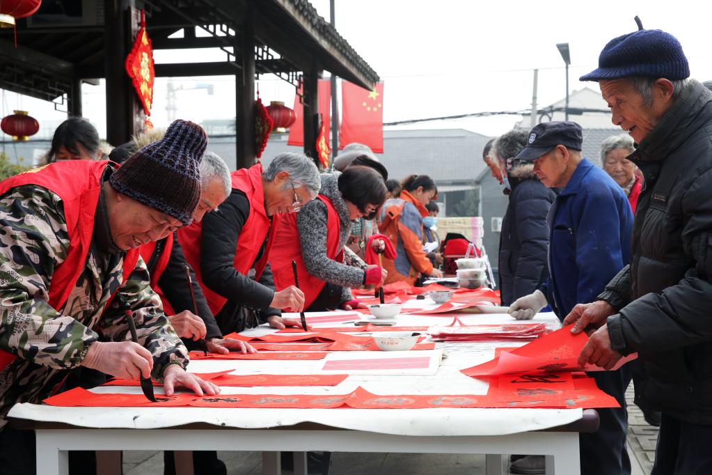 2022年1月15日,在浙江省湖州市德清縣乾元鎮東郊社區,志愿者給居民書(shū)寫(xiě)春聯(lián)。新華社發(fā)(倪立芳 攝)