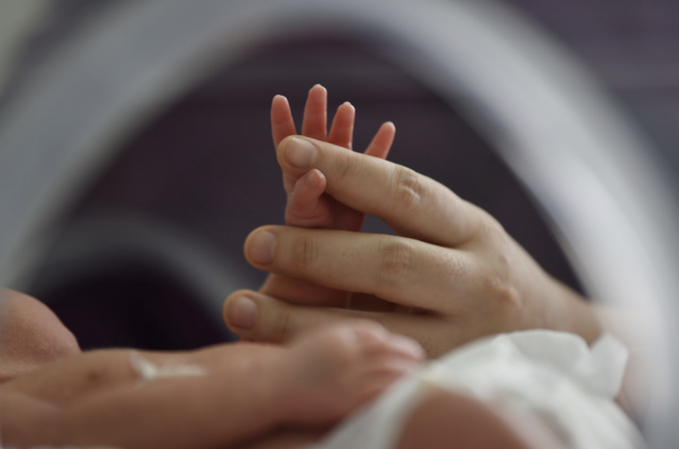 2022年1月1日,在江蘇南京市江寧醫院,醫護人員跟一個(gè)新生兒握手。新華社發(fā) 方東旭 攝