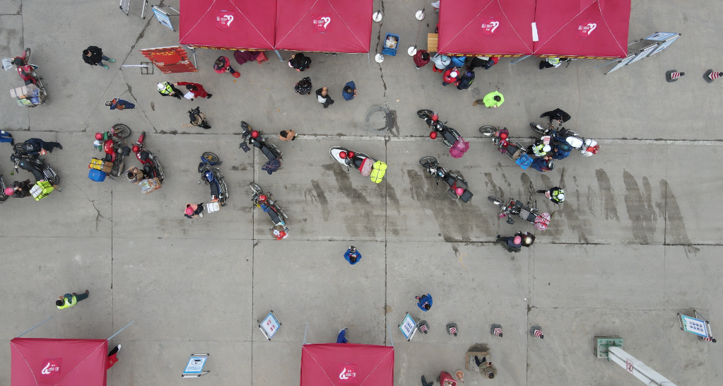 圖為摩托騎手在321國道梧州東出口春運服務(wù)站休息。(新華社記者雷嘉興1月25日無(wú)人機拍攝)
