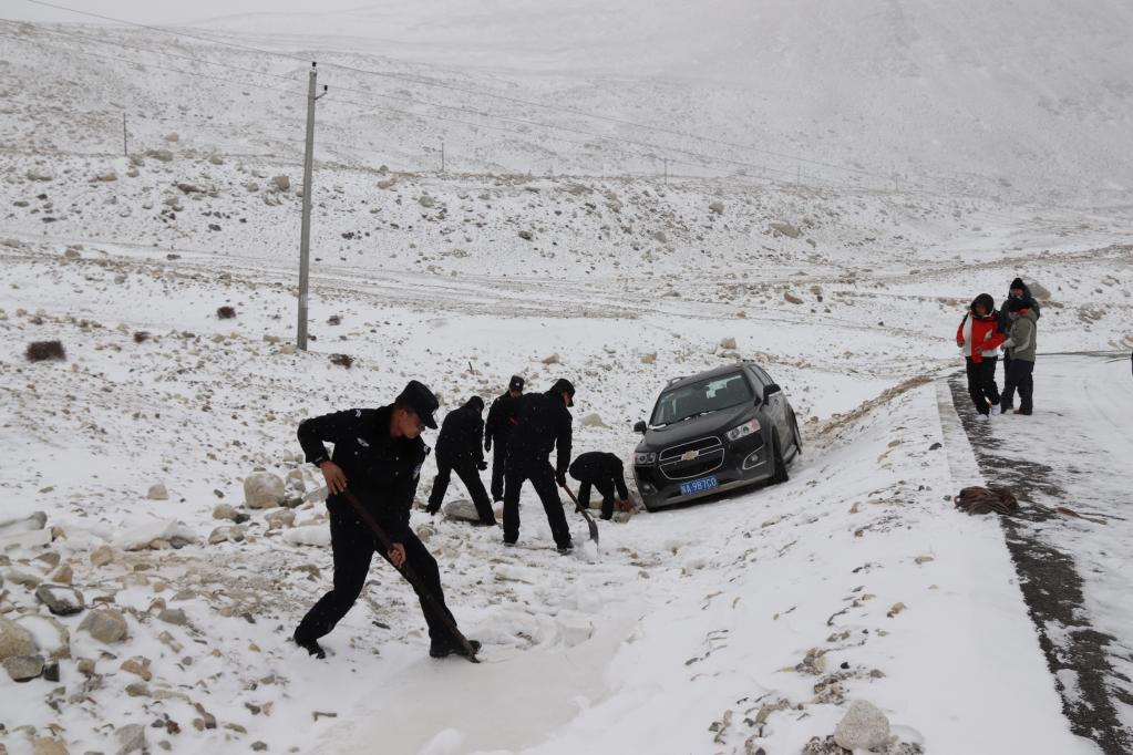 珠峰邊境派出所移民管理警察幫助游客救援車(chē)輛。(受訪(fǎng)單位供圖)