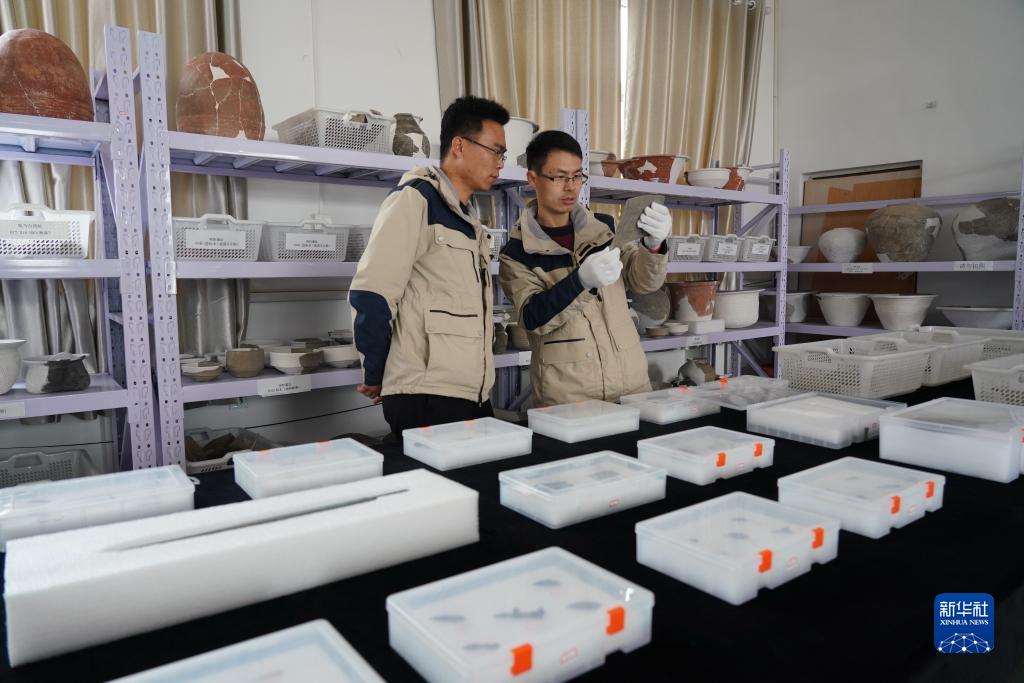 考古隊員在研究河北雄安新區南陽(yáng)遺址的出土器物(2021年3月19日攝)。新華社記者 牟宇 攝