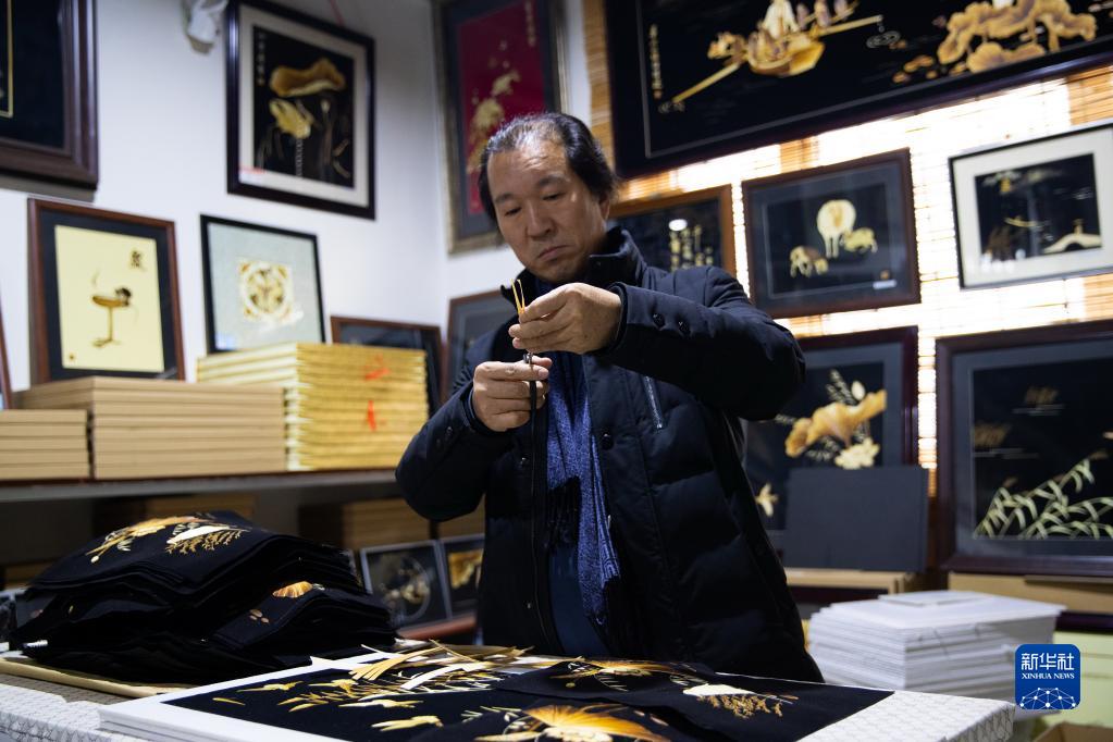 河北省非物質(zhì)文化遺產(chǎn)蘆葦畫(huà)技藝傳承人楊丙軍在制作蘆葦畫(huà)(2019年1月8日攝)。新華社發(fā)(王京卓 攝)