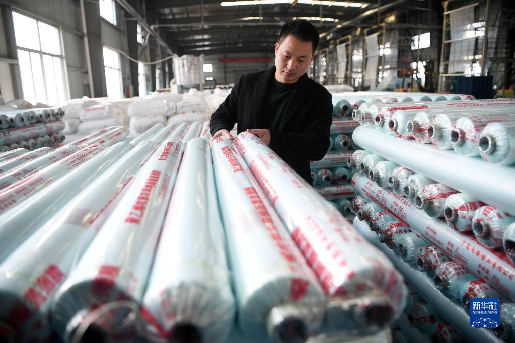 鄭開(kāi)煌在位于寧夏隆德縣閩寧扶貧產(chǎn)業(yè)園的農用薄膜生產(chǎn)線(xiàn)查看產(chǎn)品質(zhì)量(1月28日攝)。新華社記者 王鵬 攝