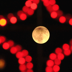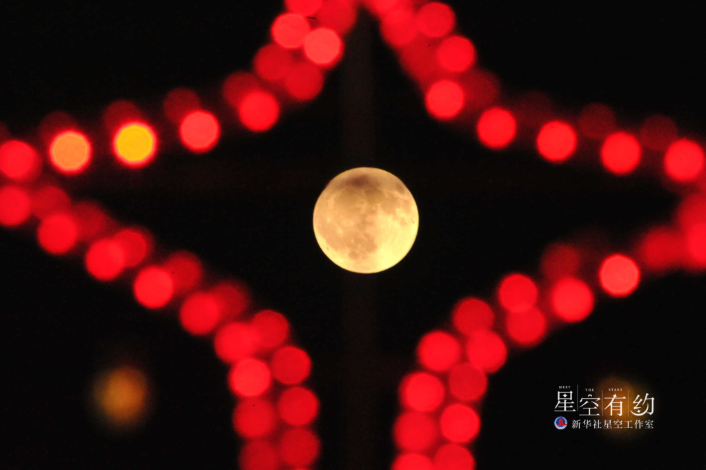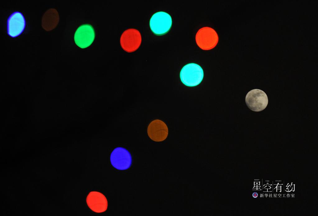 這是2013年2月24日元宵節,北京夜空的月亮與五彩繽紛的燈飾相映成輝。這一年的元宵月是“十七圓”。(新華社記者何俊昌攝)