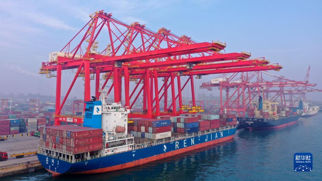 1月26日,貨輪??吭谏綎|日照港集裝箱碼頭進(jìn)行裝卸作業(yè)(無(wú)人機照片)。新華社記者 郭緒雷 攝