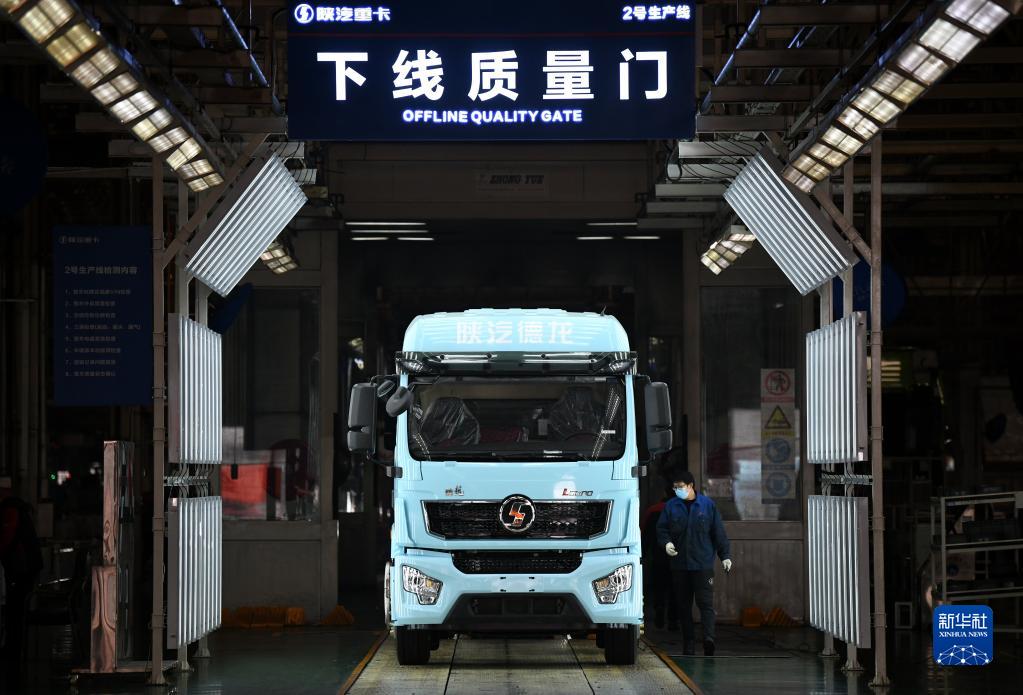 1月20日,工作人員在陜西汽車(chē)控股集團有限公司總裝車(chē)間驗收一輛裝配完畢的重型卡車(chē)。新華社記者 李一博 攝
