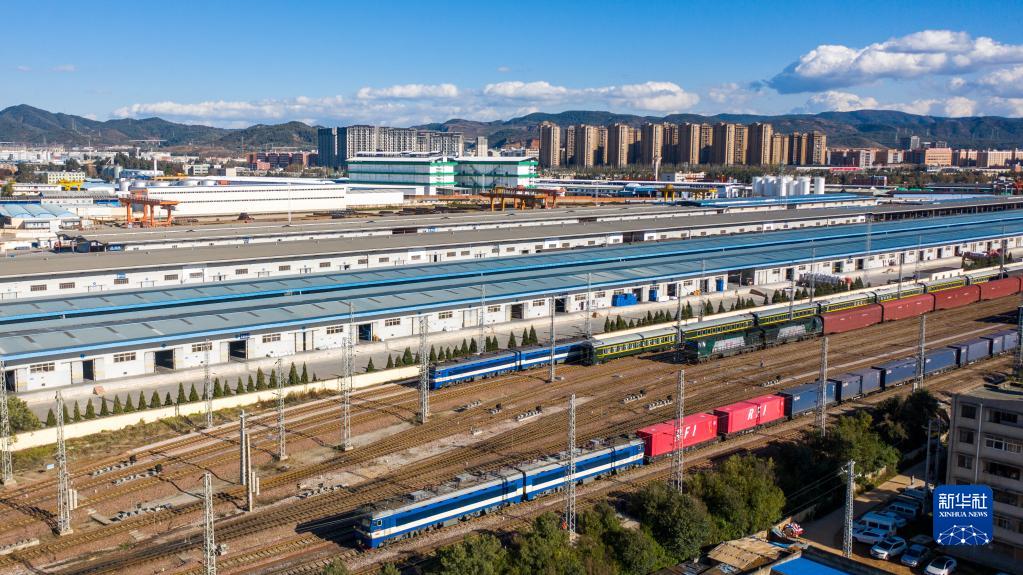 1月1日,滿(mǎn)載30個(gè)標準集裝箱的中老鐵路新年首趟國際貨物列車(chē)(前)從昆明開(kāi)往老撾萬(wàn)象(無(wú)人機照片)。新華社記者 胡超 攝