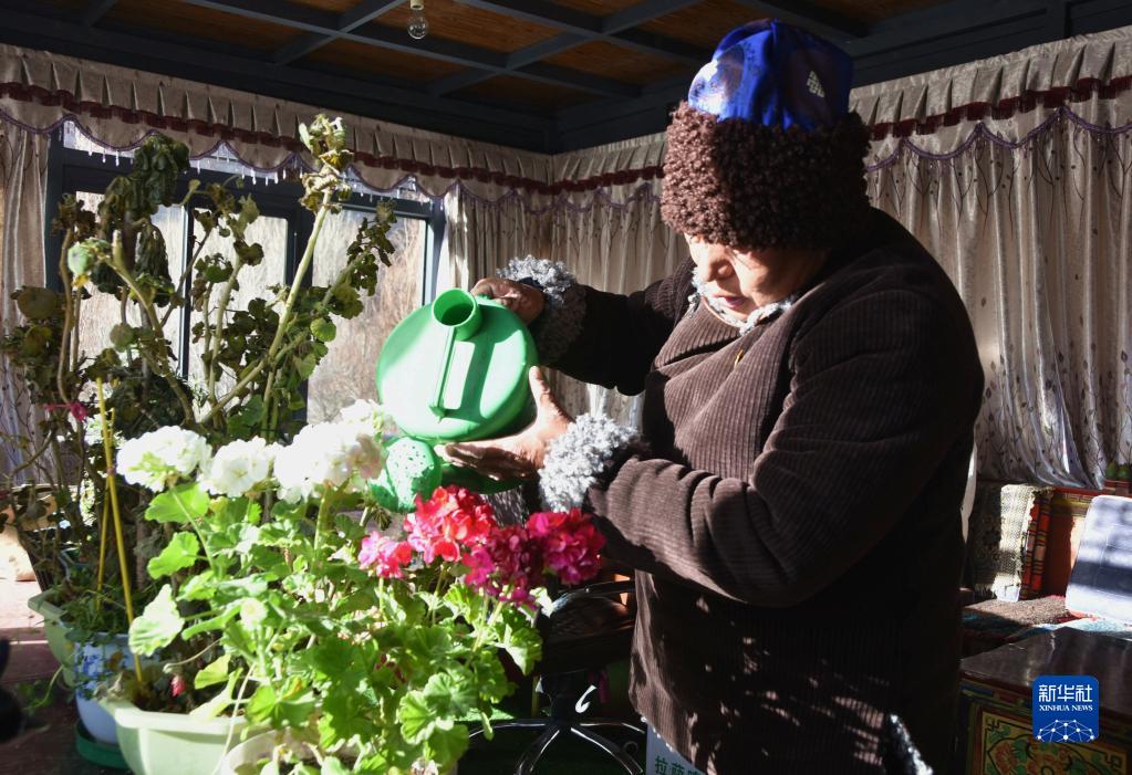 西藏洛扎縣嘎波社區扎麥村村民達瓦次仁在給陽(yáng)光房里的盆栽澆水(1月19日攝)。新華社記者 陳尚才 攝