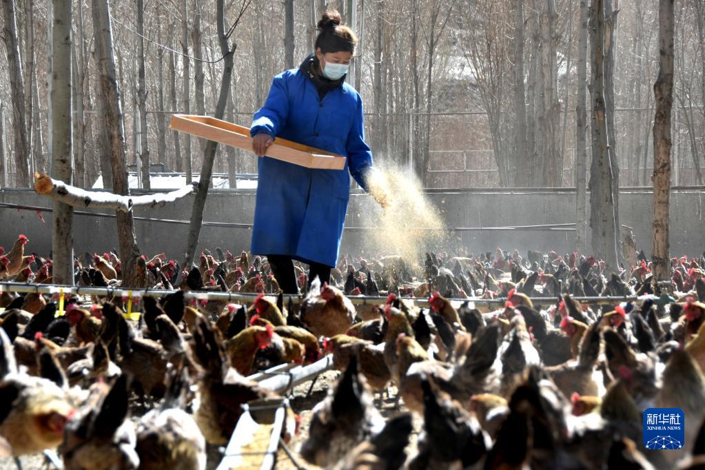 西藏洛扎縣次麥藏雞養殖合作社工作人員在給藏雞喂食(1月19日攝)。新華社記者 陳尚才 攝