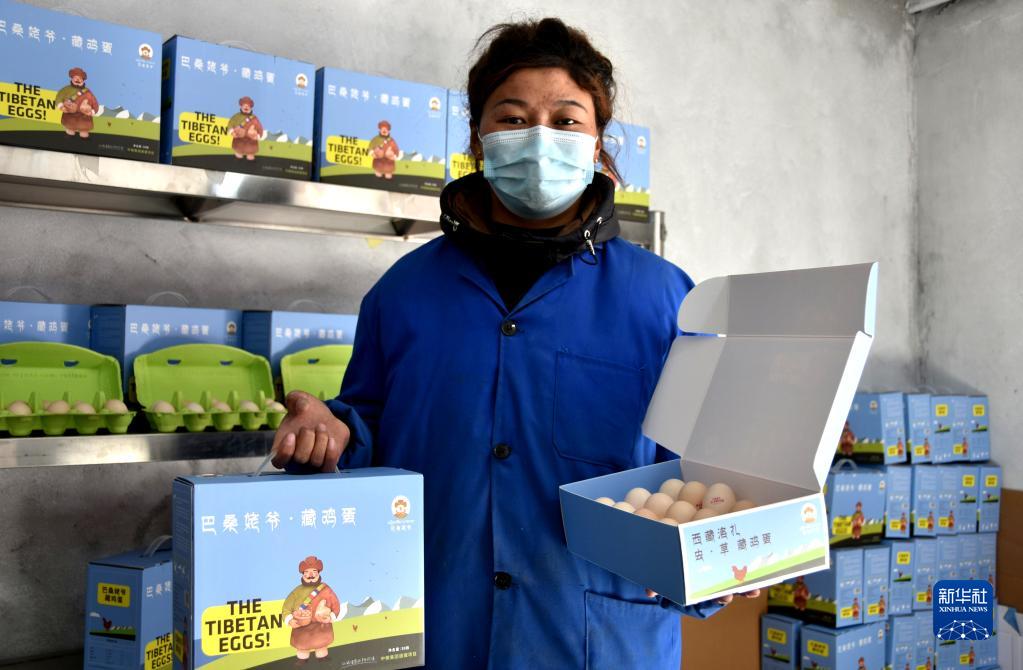 西藏洛扎縣次麥藏雞養殖合作社工作人員在展示特色產(chǎn)品藏雞蛋(1月19日攝)。新華社記者 陳尚才 攝
