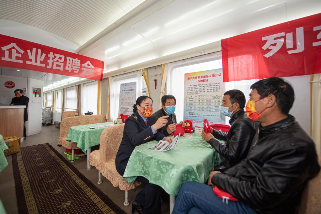 2月18日,列車(chē)員向旅客介紹企業(yè)招聘信息。新華社記者江漢攝