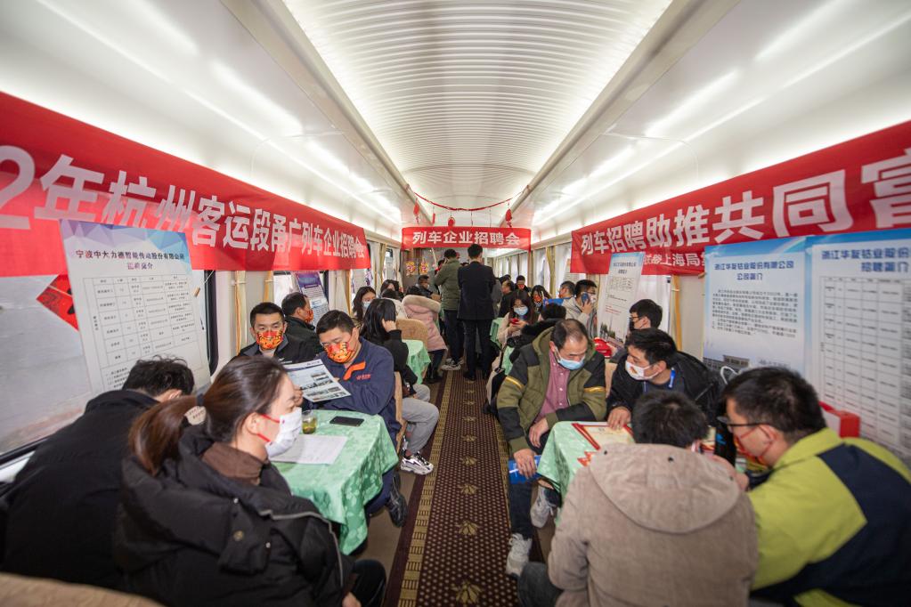 這個(gè)想法得到浙江省總工會(huì )以及寧波、衢州、湖州等地政府和企業(yè)的支持。據悉,今年已是杭州客運段連續第二年在列車(chē)上舉辦招聘會(huì )。今年這場(chǎng)招聘會(huì )共有9家企業(yè)提供56個(gè)工種、4269個(gè)崗位。