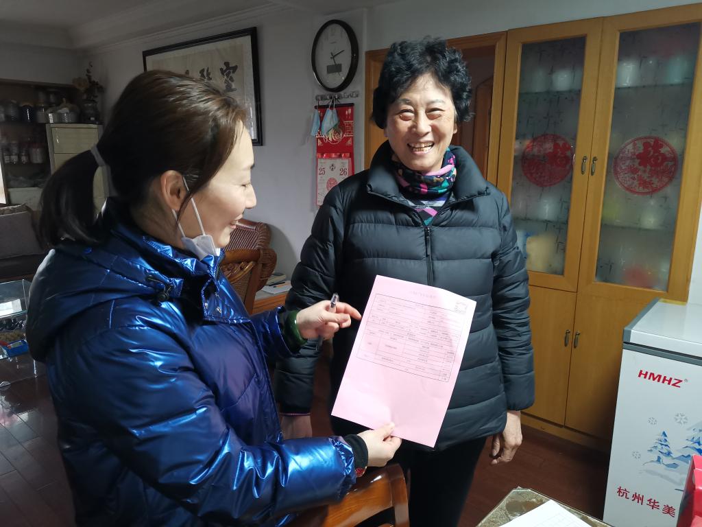 杭州市德加社區社工為困難群眾送達紙質(zhì)版“幸福清單”,并教授“幸福碼”使用方式。(采訪(fǎng)對象供圖)
