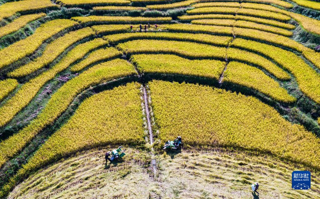 2021年9月21日,湖北省秭歸縣沙鎮溪鎮村民在田間收獲高山冷水稻(無(wú)人機照片)。新華社發(fā)(向紅梅 攝)