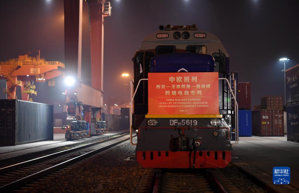 2021年12月31日晚,中歐班列長(cháng)安號跨境電商專(zhuān)列在西安國際港站準備出發(fā)開(kāi)往德國曼海姆。新華社記者 李一博 攝