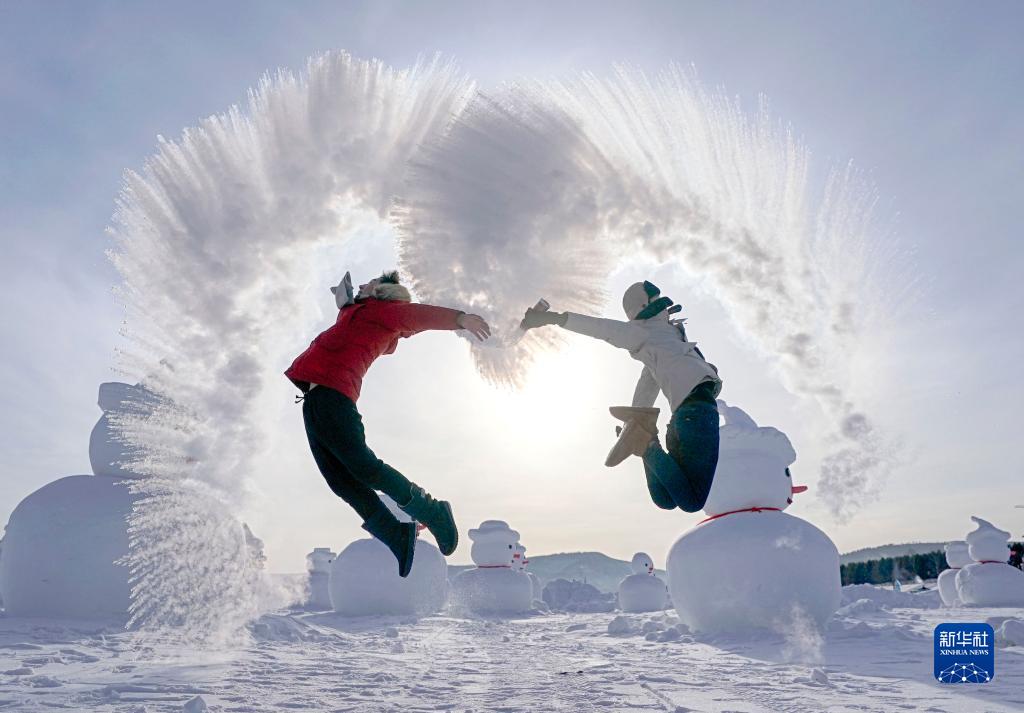 2019年1月24日,在黑龍江省漠河市北極村,游客體驗“潑水成冰”游戲。新華社記者 才揚 攝