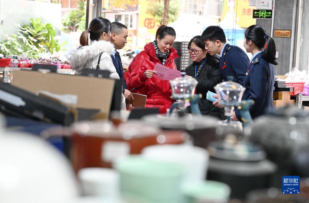 2020年12月17日,在福建省德化縣,稅務(wù)工作人員向一家電商企業(yè)負責人(左三)宣傳介紹疫情防控期間小微企業(yè)的稅收優(yōu)惠政策。新華社記者 林善傳 攝