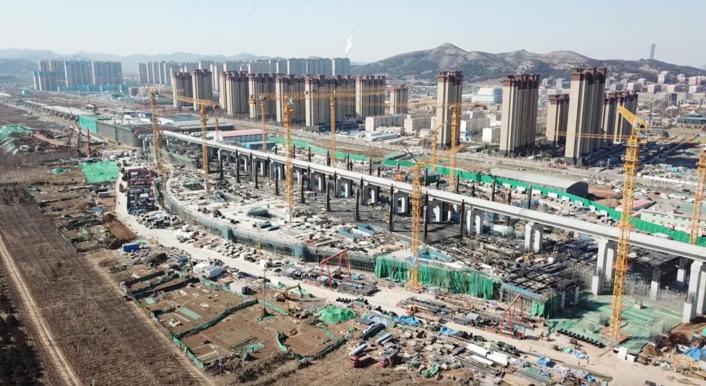 圖為2月22日,山東省濟南市濟萊高鐵港溝站施工現場(chǎng)。 新華社記者 李小波 攝