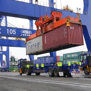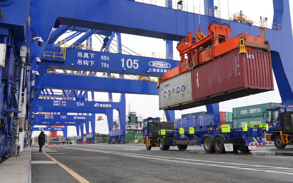圖為2月21日下午,在洋浦國際集裝箱碼頭內,工作人員正引導貨車(chē)轉運集裝箱。該碼頭是海南自貿港建設的重要集裝箱航運樞紐。 新華社記者 王軍鋒 攝