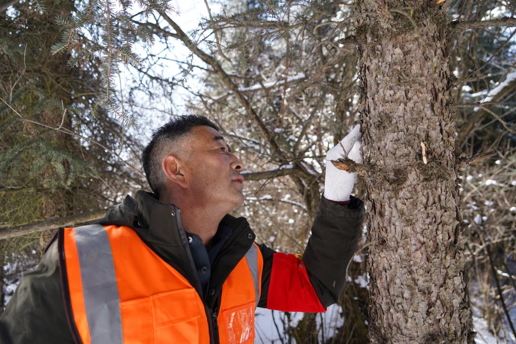 圖為2月20日,在青海省海東市的上北山林場(chǎng),護林員趙以成正在觀(guān)察樹(shù)木長(cháng)勢。 新華社記者 耿輝凰 攝
