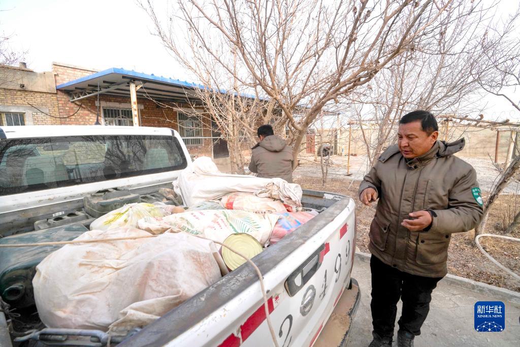 尉犁縣國有林管理局負責人艾力·尼亞孜來(lái)到國家級公益林尉犁縣營(yíng)盤(pán)管護站,給護林員們送來(lái)了蔬菜和糧油(2月20日攝)。新華社記者 趙戈 攝