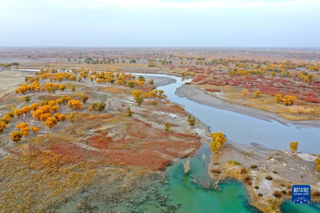 從空中俯瞰塔里木河下游一處胡楊林(2021年10月21日攝,無(wú)人機照片)。新華社記者 趙戈 攝