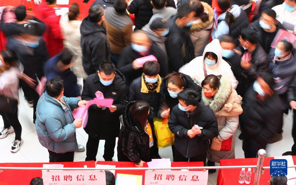 2022年2月19日,求職人員在山東省滕州市“春風(fēng)送崗”春季人才招聘會(huì )上尋找就業(yè)崗位。新華社發(fā)(李志軍攝)