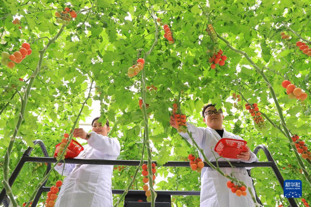 2022年2月18日,湖南省東安縣華維節水公司智慧農業(yè)大棚內,員工們采摘圣女果準備上市。新華社發(fā)(嚴潔攝)