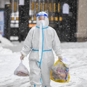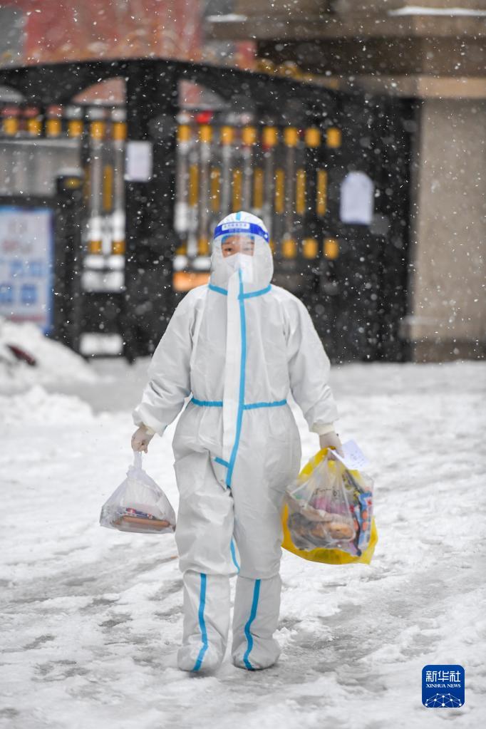 3月15日,吉林省吉林市昌邑區興華街道中興社區網(wǎng)格員宋冉為隔離居民運送生活物資。新華社記者 張楠 攝