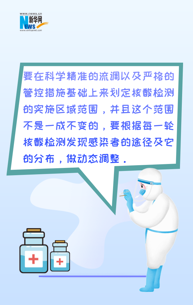 焦雅輝也強調,要在科學(xué)精準的流調以及嚴格的管控措施基礎上來(lái)劃定核酸檢測的實(shí)施區域范圍,并且這個(gè)范圍不是一成不變的,要根據每一輪核酸檢測發(fā)現感染者的途徑及它的分布,做動(dòng)態(tài)調整。