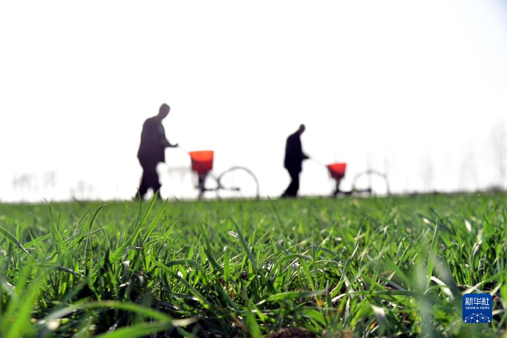3月14日,在山東省聊城市茌平區胡屯鎮,農民給麥田追肥?!⌒氯A社發(fā)(趙玉國 攝)