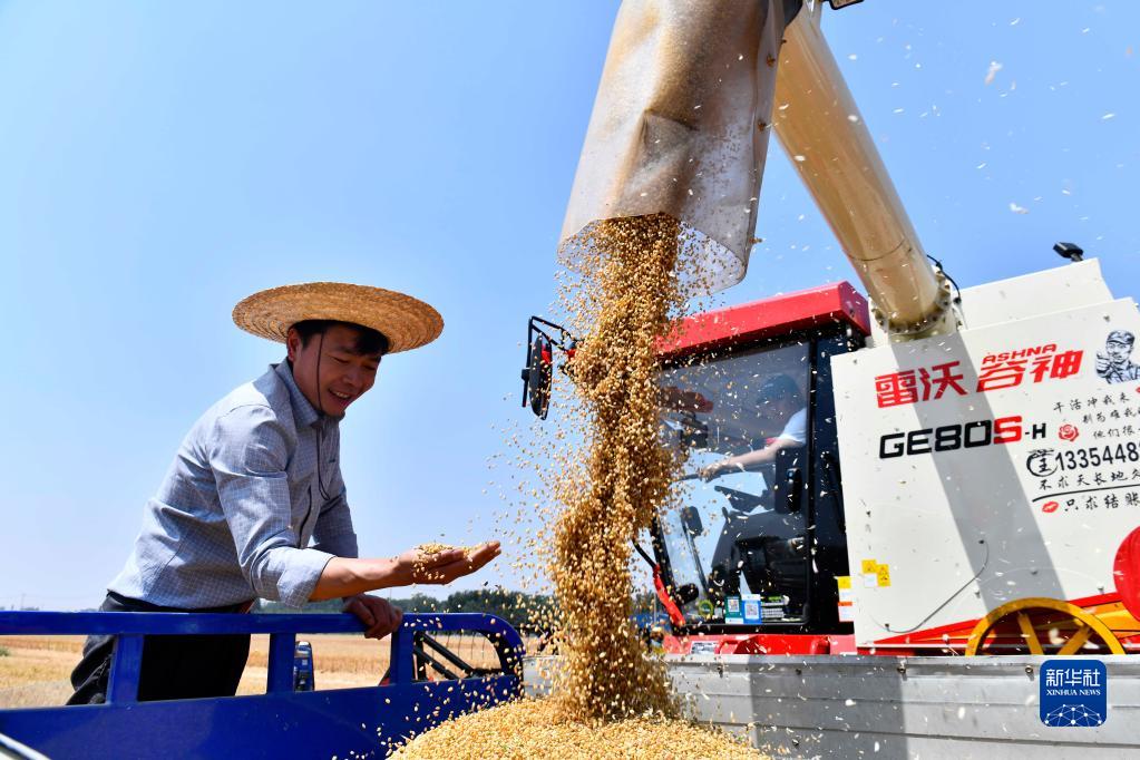 在山東滕州市官橋鎮,農民查看新收獲小麥的質(zhì)量情況(2021年6月4日攝)?!⌒氯A社記者 郭緒雷 攝