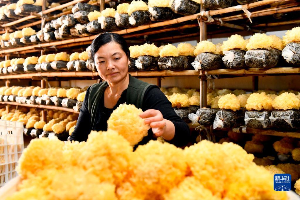 在山東省惠民縣銀豐食用菌合作社,農民采摘銀耳(2021年11月18日攝)?!⌒氯A社記者 郭緒雷 攝