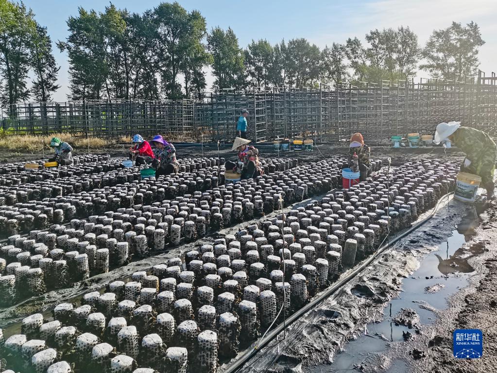 在黑龍江省寶清縣寶清鎮雙泉村的食用菌基地,村民采摘木耳(2021年7月3日攝)?!⌒氯A社發(fā)