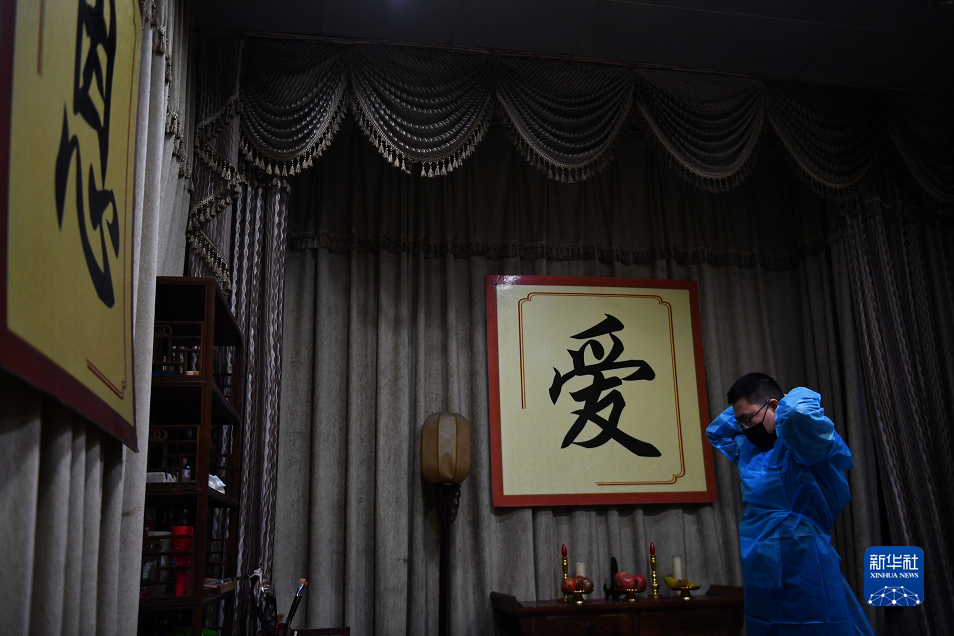 周哲在明陽(yáng)山殯儀館為遺體做化妝前的準備工作。新華社記者陳振海攝
