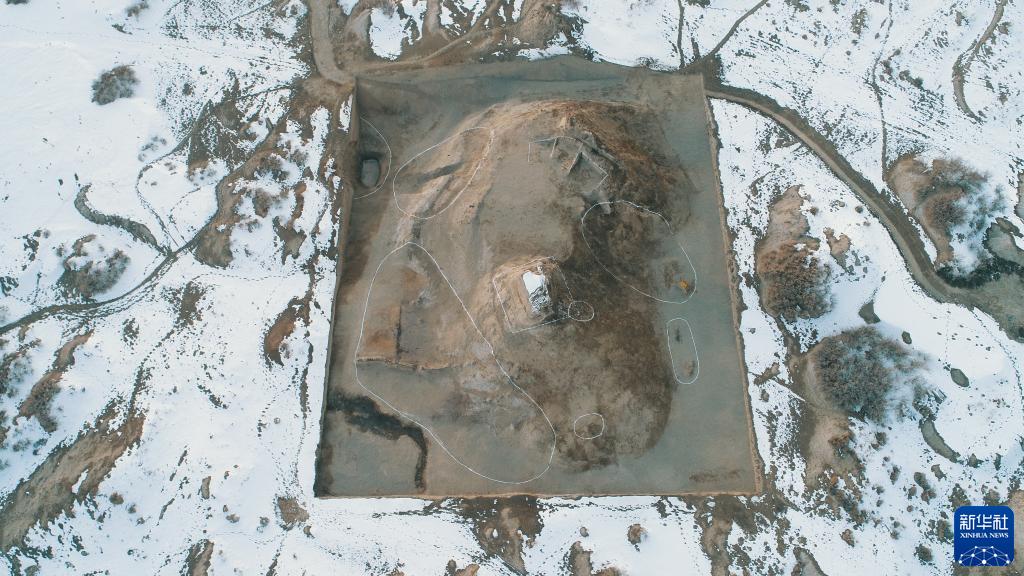 俯瞰克亞克庫都克烽燧發(fā)掘現場(chǎng)(2021年12月11日攝,無(wú)人機照片)。新華社發(fā)(胡興軍 攝)