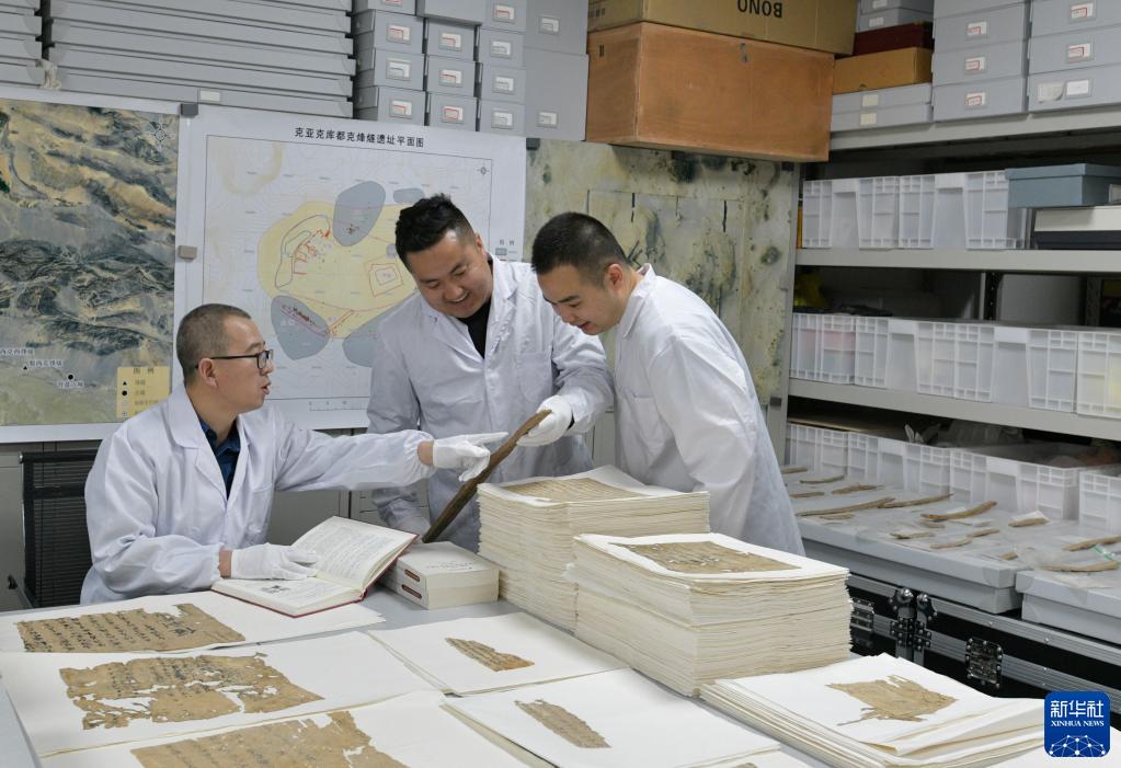 新疆文物考古研究所研究館員胡興軍(左一)與隊員整理出土文書(shū)(資料照片)。新華社發(fā)(劉玉生 攝)