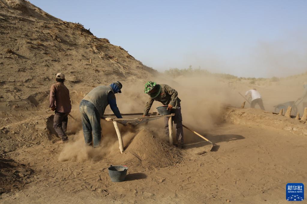 考古工作隊成員在克亞克庫都克烽燧遺址開(kāi)展挖沙、篩沙工作(資料照片)。新華社發(fā)(胡興軍 攝)