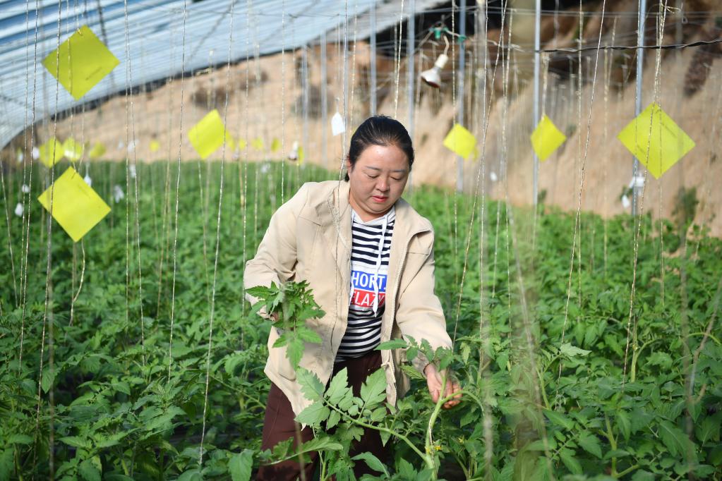 4月2日,延安市宜川縣丹州街道王灣村村民張榮在對西紅柿進(jìn)行疏枝。新華社記者邵瑞 攝