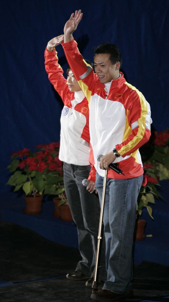 2005年11月6日,2005世界花滑大獎賽(中國站)在北京閉幕,花樣滑冰世界冠軍申雪(左)和趙宏博在首都體育館向觀(guān)眾致意。此時(shí)的趙宏博需要拐杖支撐行動(dòng)。新華社記者攝
