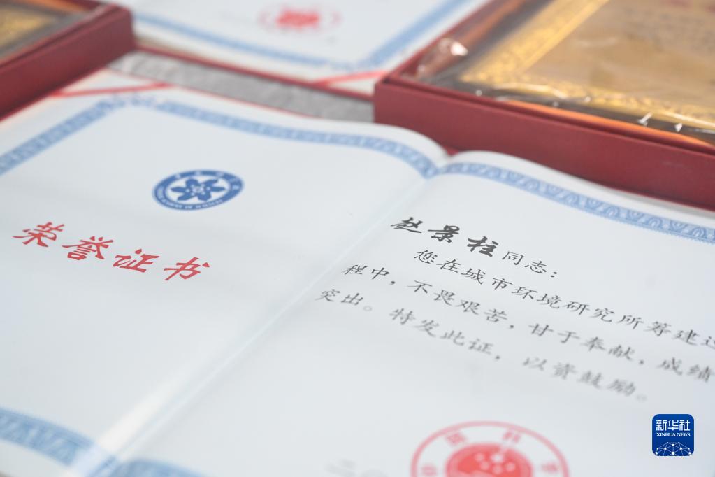中科院城市環(huán)境研究所原黨委書(shū)記趙景柱獲得的榮譽(yù)證書(shū)(2021年12月31日攝)。新華社記者 林善傳 攝