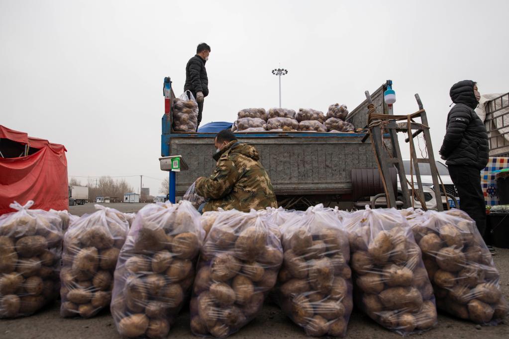 在哈爾濱潤恒農產(chǎn)品批發(fā)市場(chǎng),載有果蔬的貨車(chē)在市場(chǎng)入口排成一隊,身著(zhù)防護服的工作人員正進(jìn)行貨車(chē)登記、掃碼等工作。