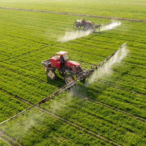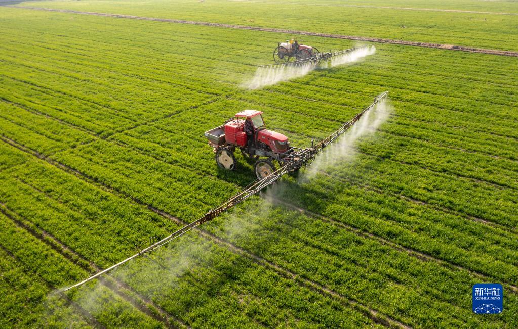 在江蘇省海安市大公鎮賁集村,村民駕駛植保機械在小麥田間進(jìn)行噴灑藥物作業(yè)(3月9日攝,無(wú)人機照片)。新華社發(fā)(翟慧勇 攝)