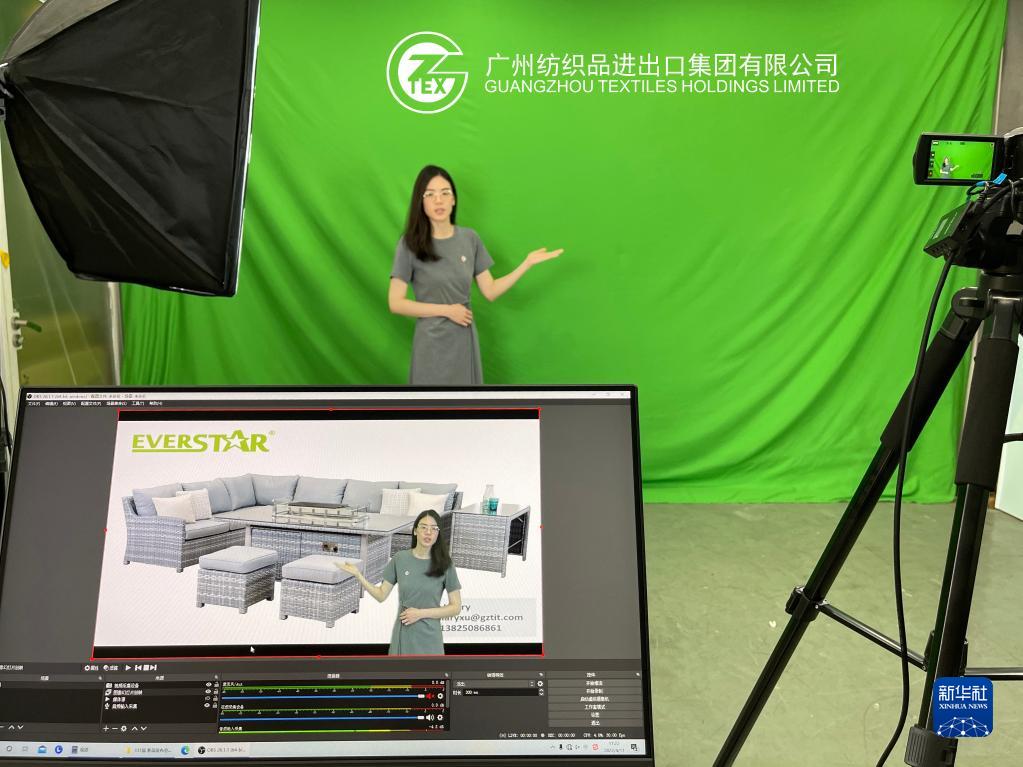 廣州輕工工貿集團紡織品進(jìn)出口公司員工利用綠幕技術(shù)排練廣交會(huì )上“云展示”(4月11日攝)。新華社發(fā)(受訪(fǎng)者供圖)