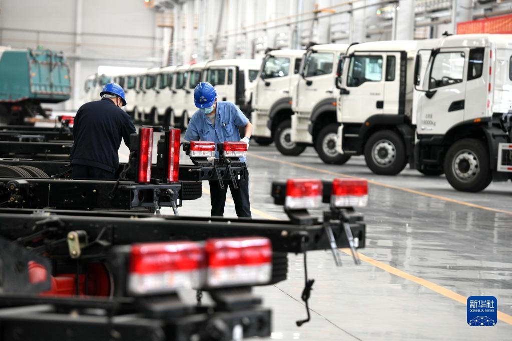 在位于石家莊市欒城區的石家莊煤礦機械有限責任公司車(chē)間內,工作人員組裝新能源環(huán)衛車(chē)(4月12日攝)。新華社記者 李繼偉 攝